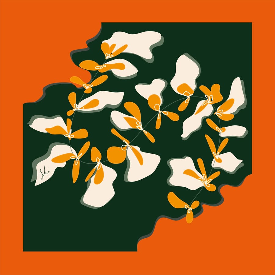 Le modèle FORÊT est dans les tons de orange, crème et kaki avec des fleurs d’or.